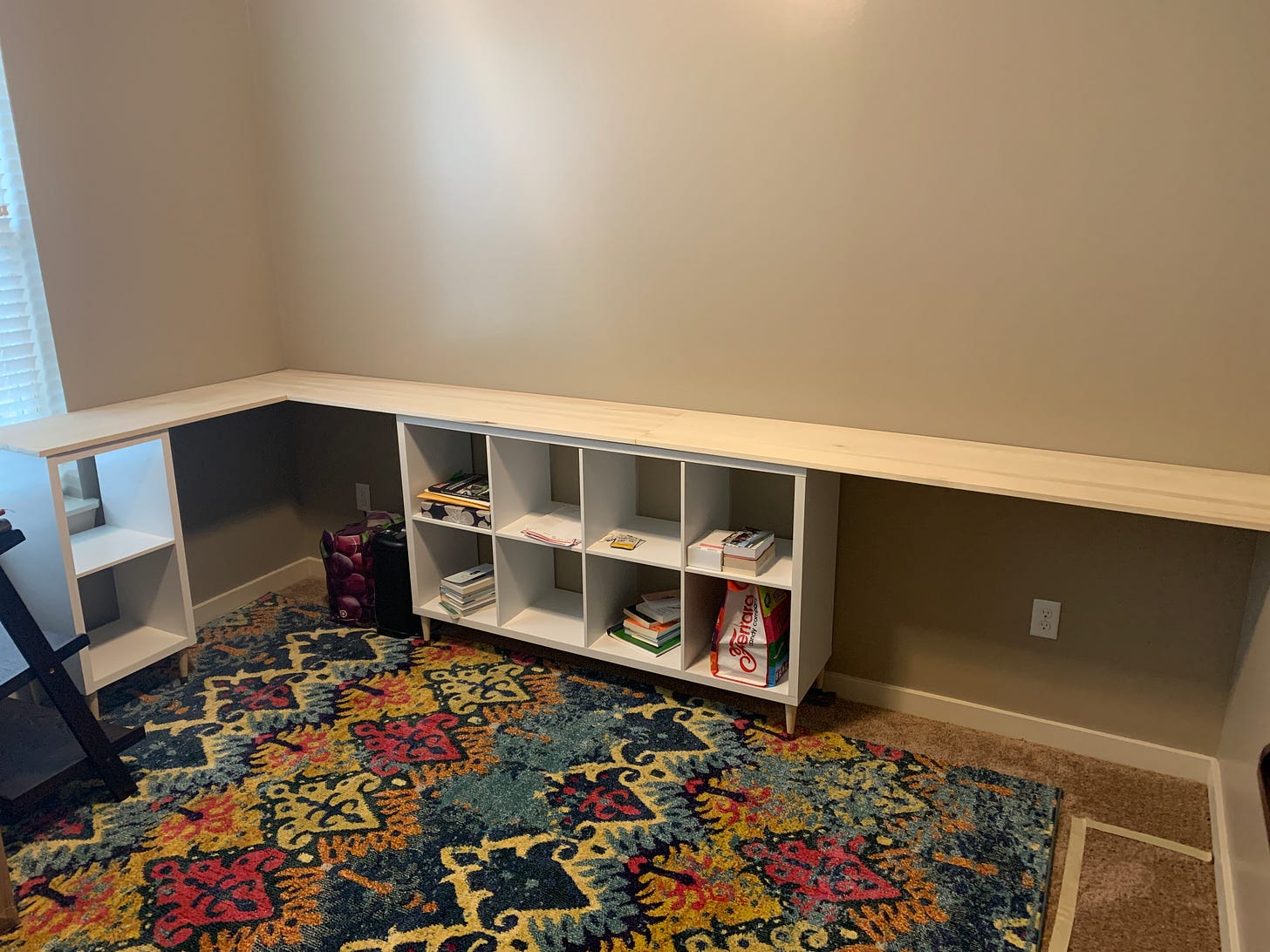 I wish I had some progress photos of this custom counter, or a video of the install because it was a riot. Or a disaster. But it worked. I pinned and bracketed together these smooth pine boards to make a narrow counter that is supported by some Target cube storage units that are mounted onto some $4 Lowes furniture legs. The right end is supported by a shelf bracket. I really tried to minimize anything securing into the wall given that it was temporary. I sealed it up with polyurethane to make it easy to clean and super smooth.