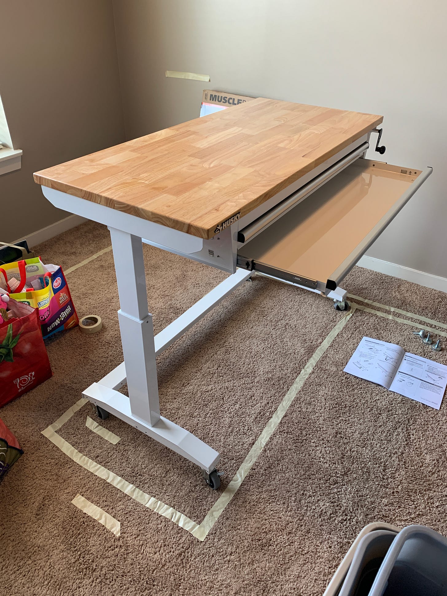 And I will forever sing praise for this table. It’s a Husky workbench that adjusts in height, has the smooooothest drawers, and a REAL hardwood top. It was under $200 when I purchased it…but with inflation/supply chain, etc. it now looks to be $275. I firmly believe that it is still worth that price and more! It also weighs a LOT and I had to move it from my car, up to the 3rd floor…in pieces.