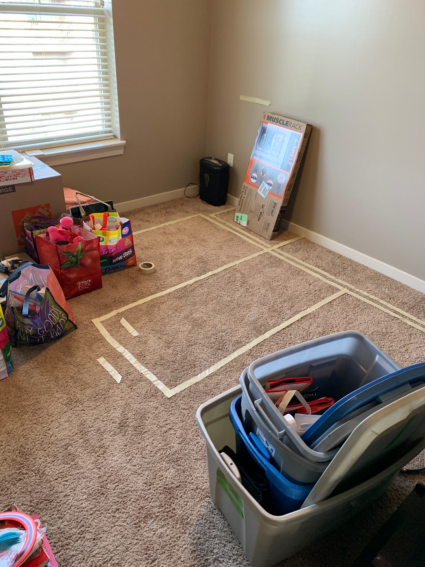 I don’t have a great bare “before” photo because I started planning the lab out the day that I moved in. I used masking tape to tape out the dimensions of the counters and tables that I planned to build or buy in order to maximize the space. I wanted a separate office space from the lab space…and also needed to figure out how to protect the carpet from splashes and additional move out fees!